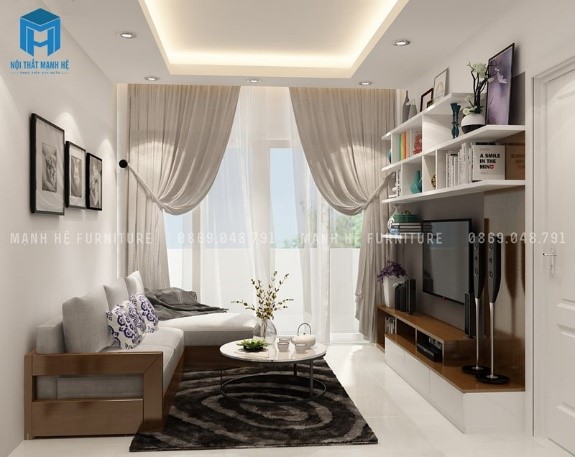 Kệ tivi kết hợp với kệ sách phía trên giúp cho tường không bị trống trải. Chiếc tivi nhỏ treo tường phù hợp vớ kích thước phòng. Phòng khách nhỏ trở nên rộng và mát hơn nhờ hệ thông cửa sổ lớn tạo không gian mở với rèm cửa hiện đại.