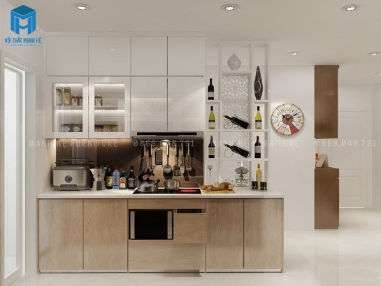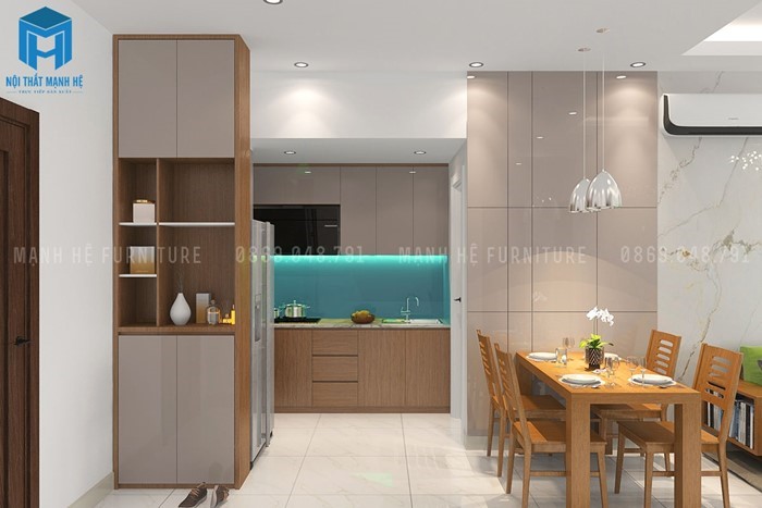 Khu bếp được bố trí ngay cạnh khu vực phòng khách nối với bàn ăn, tạo lối giao thông thuận lợi, di chuyển dễ dàng giữa các khu vực chức năng và khu sinh hoạt chung.