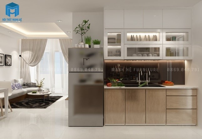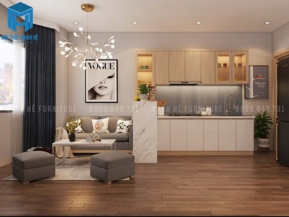 Với những chung cư nhỏ, việc lựa chọn một chiếc sofa nhỏ, giảm bớt kệ tivi cũng là những giải pháp hợp lý để tăng không gian sử dụng. Trong trường hợp này, gia chủ cũng nên chọn những đồ nội thất đơn giản với chi tiết nhỏ, mảnh. Tủ bếp chữ I tiết kiệm diện tích liền với sofa.