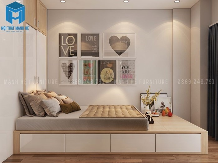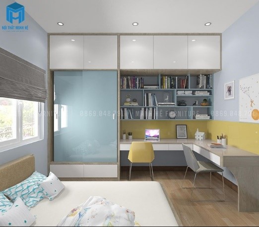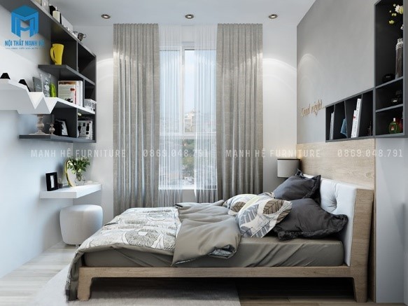 Giường ngủ, góc làm việc kết hợp với tủ tivi cỡ nhỏ tạo hệ thống lưu trữ đồ và sử dụng một cách liền mạch và gọn gàng, bên trên là những chiếc kệ gỗ giúp tiết kiệm diện tích. Giường ngủ được thiết kế ngăn chứa đồ lớn giúp căn phòng thêm gọn gàng hơn.