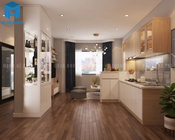 Không gian được nối thông giữa phòng bếp và phòng khách luôn là phương án tối ưu nhất được nhiều người ưa chuộng nhất hiện nay.