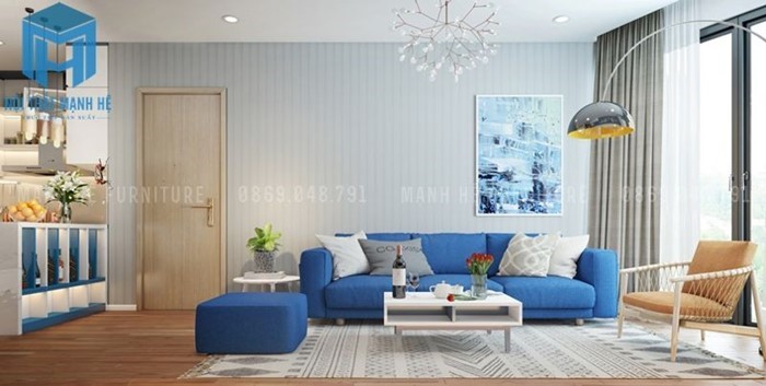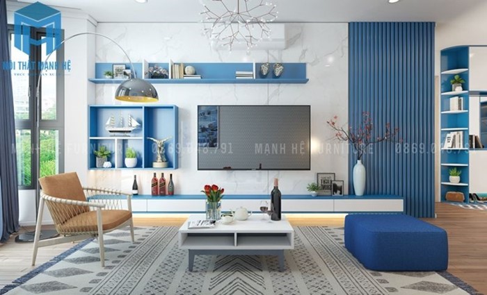 Khu tiếp khách bao gồm một chiếc sofa chữ I có kích cỡ vừa phải, một bàn nước bằng gỗ công nghiệp sáng màu và được khoanh vùng bằng một tấm thảm. Chiếc kẹ tivi được thiết kế kéo dài đối diện sofa và nằm ngay cạnh cửa sổ nên rất sáng, thoáng. Với màu xanh nổi bật căn phòng trở nên rộng hơn nhờ được chiếu sáng.