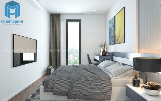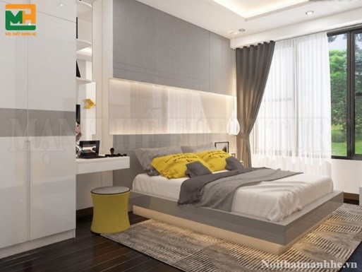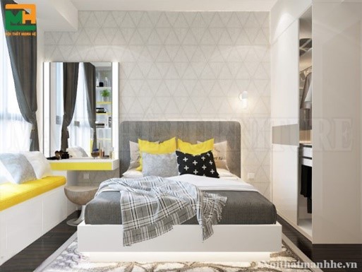 Phòng ngủ cũng nên sử dụng các tông màu sáng, hạn chế đến mức tối đa các vật dụng không cần thiết để có thể tiết kiệm diện tích. Bạn có thể lựa chọn các mẫu nội thất thông minh đa năng như tủ quần áo kết hợp với bàn làm việc hoặc kệ sách, tủ âm tường, giường gấp
