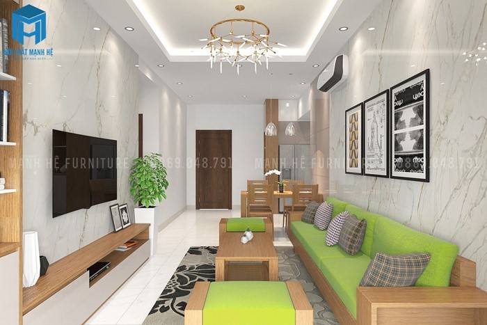 Không gian trở nên đồng bộ và có mối liên kết nhờ nội thất gỗ của sofa, bàn trà và bàn ăn. Sofa lớn và dài được tạo thêm không gian rộng cho phòng khách. Bên cạnh đó là bộ bàn ăn nhỏ xinh giúp cân đối lại không gian một cách hợp lí. Tủ bếp chữ I nhỏ được bố trí âm tường giúp tiết kiệm diện tích.