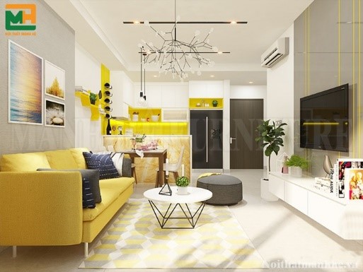 Thiết kế nội thất chung cư với gam màu trung tính tạo cảm giác thoải mái, nhẹ nhàng, tươi sáng và tiện nghi cho gia chủ. Điểm nhấn nổi bật của căn hộ là họa tiết màu vàng, cách bố trí và sắp đặt đồ đạc hợp lý mang tính nghệ thuật cao.