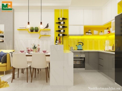 Phòng khách liền bếp được thiết kết hợp hài hòa nhờ họa tiết màu vàng. Chiếc sofa vàng lớn ở phòng khách làm điểm nhấn, toàn bộ căn phòng được chiếu sáng bằng ánh sáng tự nhiên ấm áp. Bnà ăn nhỏ xinh cho 4 người là nơi ngăn cách giữa phòng khách và bếp ăn hiện đại.