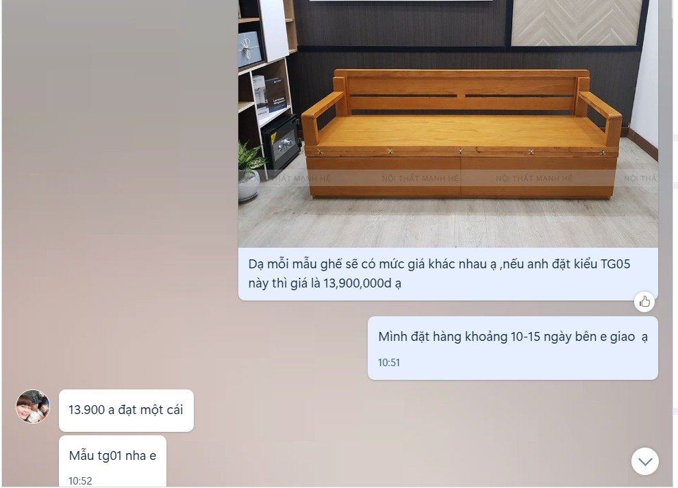 Sau khi được nhân viên của chúng tôi gửi mẫu và tư vấn về hai dạng sofa giường kéo và sofa giường gấp anh Hiệp quyết định chọn mẫu TG01 kích thước 1m8 x 1m9 .Tuy nhiên có một vấn đề về giá cả anh Hiệp có mặc cả với nhân viên chúng tôi ,giá của Mạnh Hệ là giá cố định trên web anh kêu cao hơn nhiều so với các bên khác anh đã tham khảo, anh biết tiền nào thì của đó ,cũng thấy Mạnh Hệ khá là uy tín nhưng anh vẫn nhất quyết mặc cả đòi giảm giá xuống .Nhân viên chúng tôi cũng có giải thích mỗi mẫu sẽ có một giá khác nhau anh chọn kiểu nào giá sẽ tương xứng với kiểu đó anh Hiệp im lặng và không phản hồi lại .